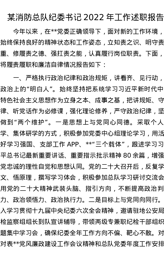 某消防总队纪委书记2022年工作述职报告
