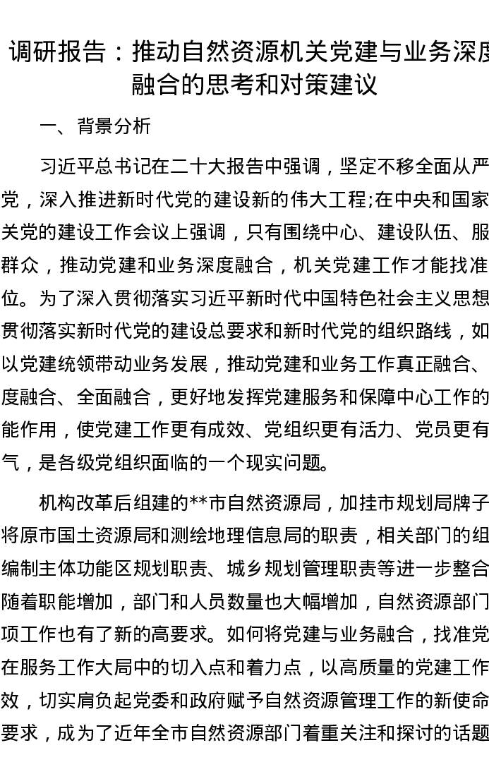 调研报告:推动自然资源机关党建与业务深度融合的思考和对策建议