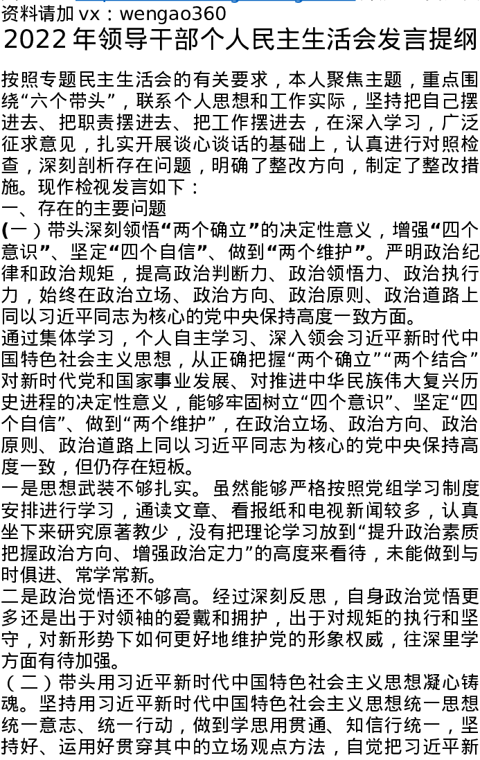 2022年领导干部个人民主生活会发言提纲(六个带头方面)