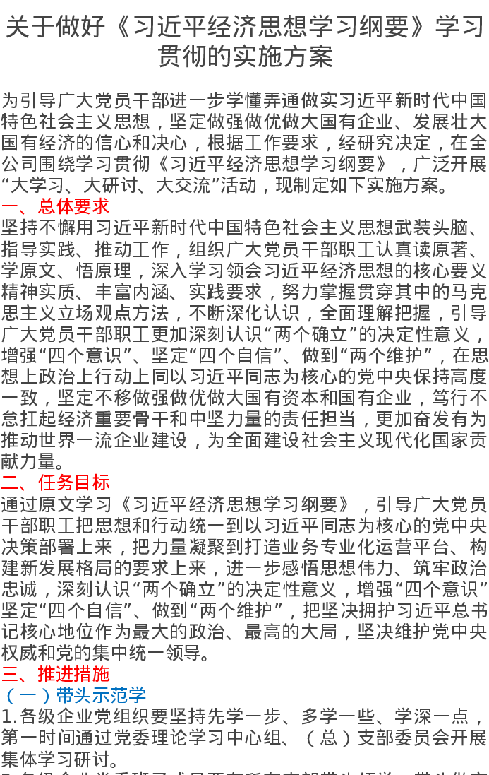 关于做好《经济思想学习纲要》学习贯彻的实施方案