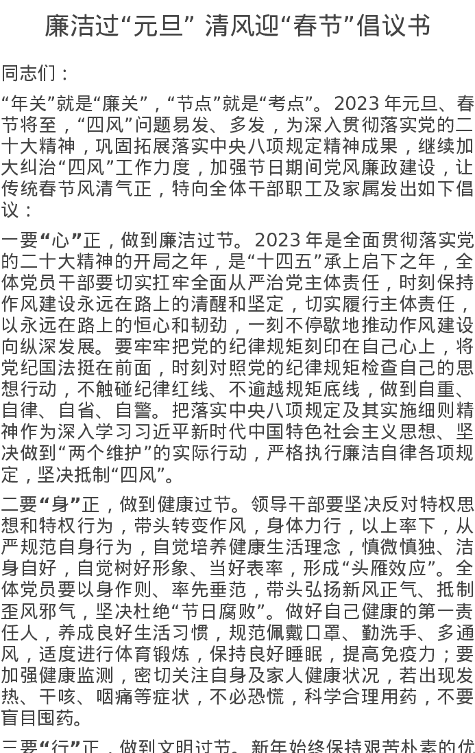 廉洁过“元旦” 清风迎“春节”倡议书