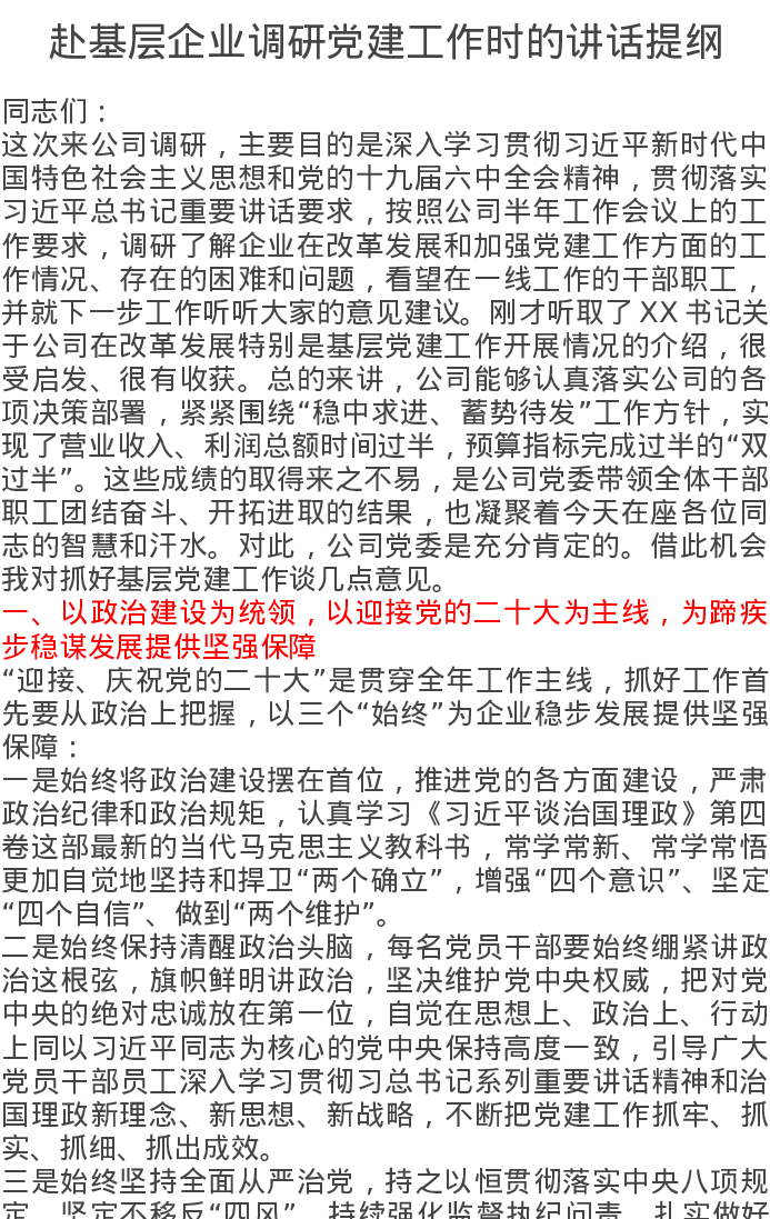 赴基层企业调研党建工作时的讲话提纲