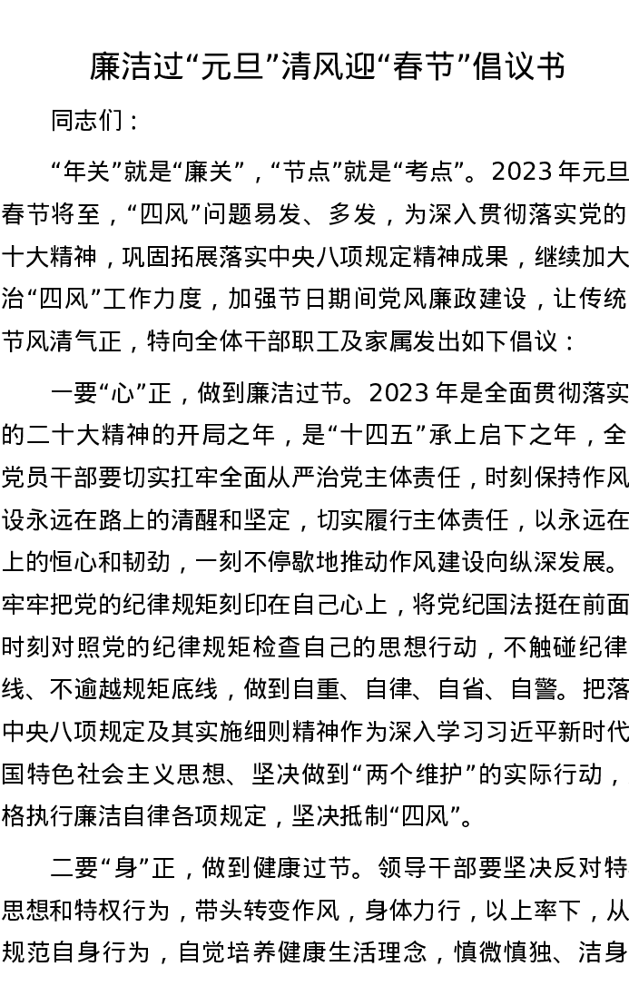 廉洁过“元旦” 清风迎“春节”倡议书