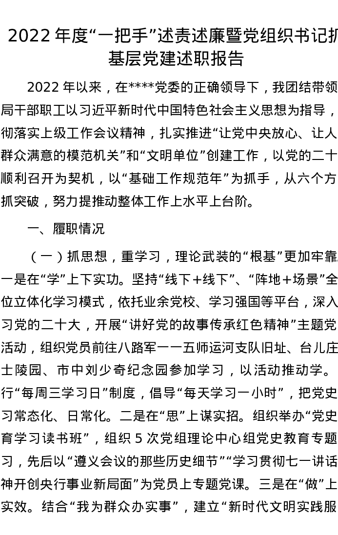 2022年度“一把手”述责述廉暨党组织书记抓基层党建述职报告