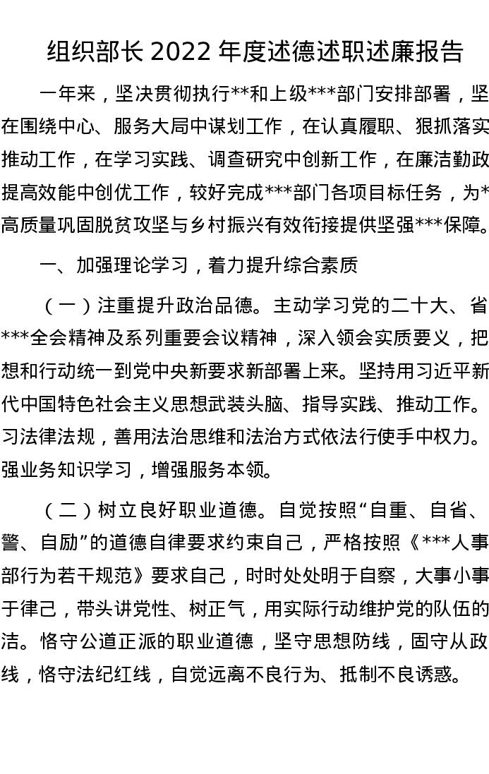 组织部长2022年度述德述职述廉报告
