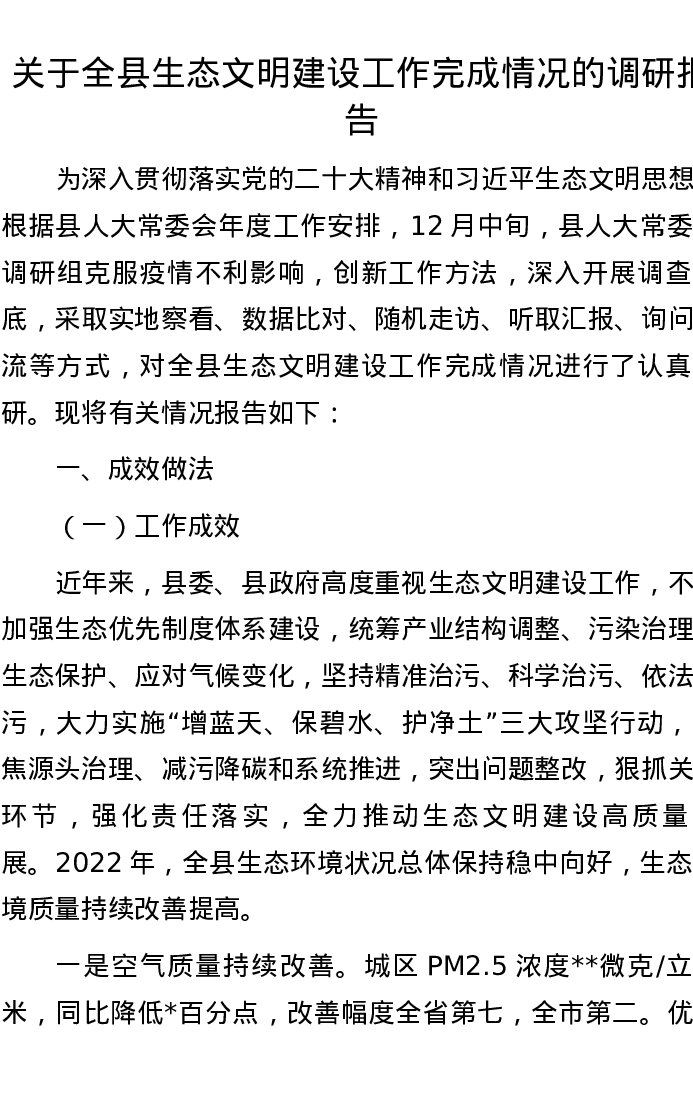 关于全县生态文明建设工作完成情况的调研报告