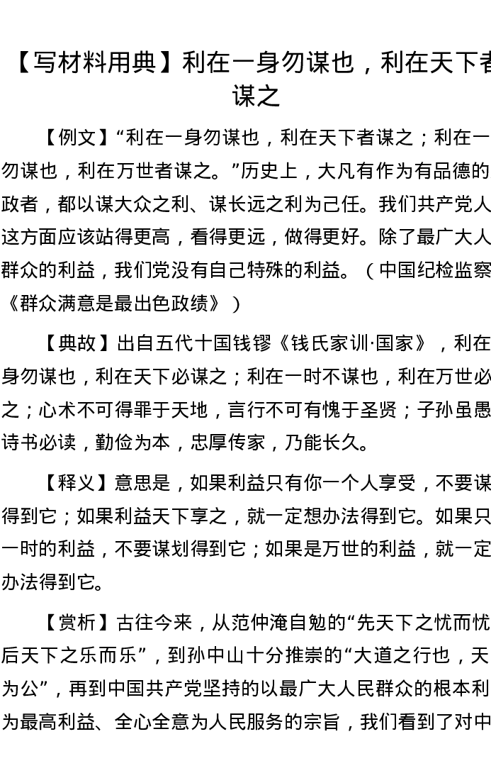【写材料用典】利在一身勿谋也,利在天下者谋之
