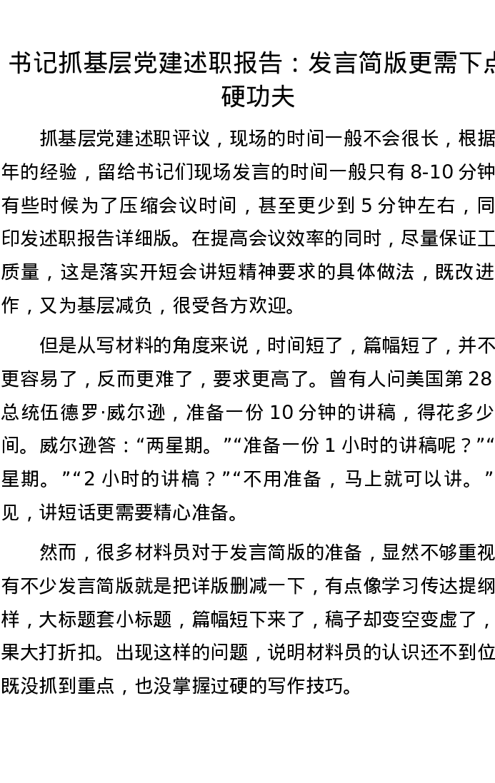 书记抓基层党建述职报告:发言简版更需下点硬功夫