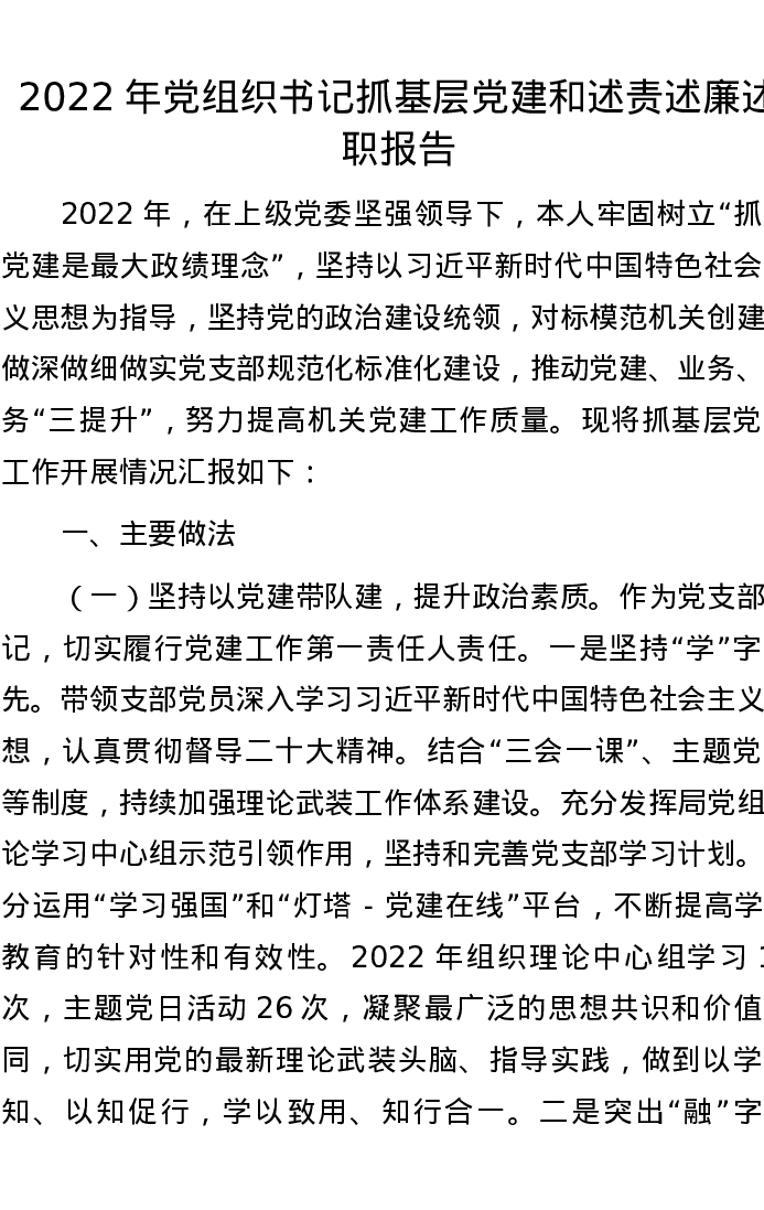2022年党组织书记抓基层党建和述责述廉述职报告