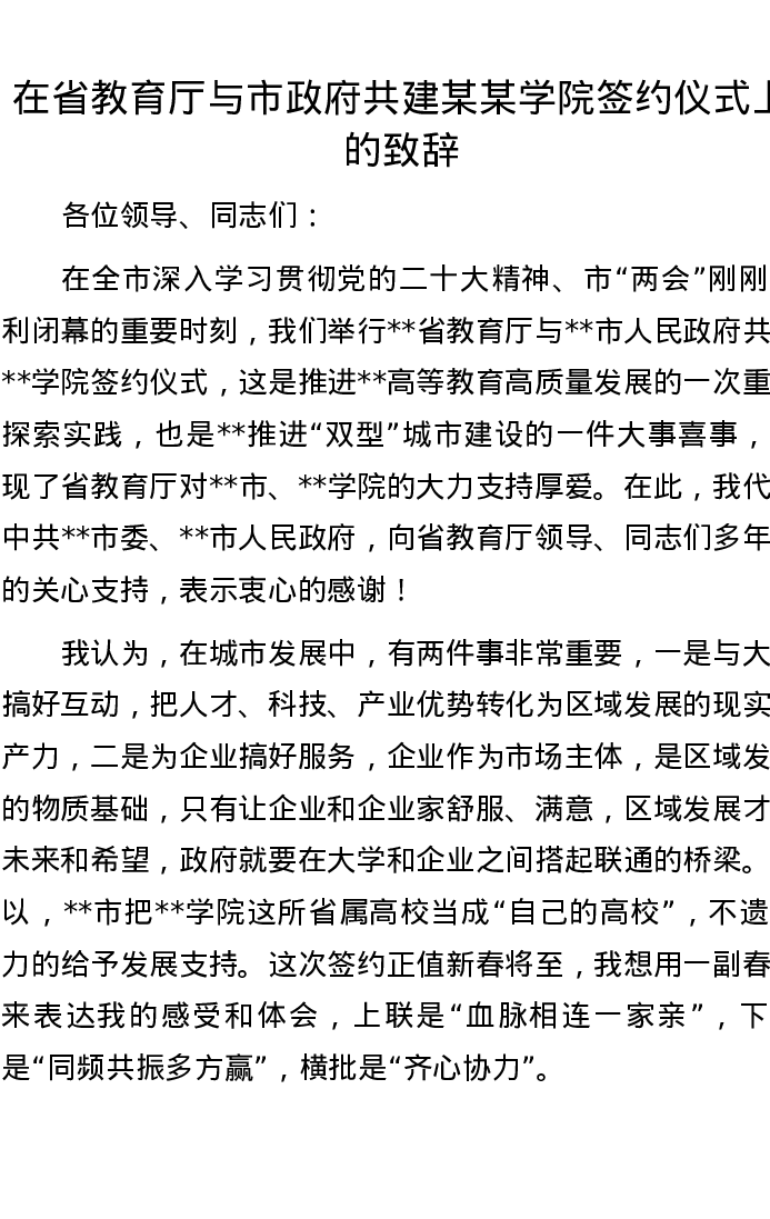 在省教育厅与市政府共建某某学院签约仪式上的致辞