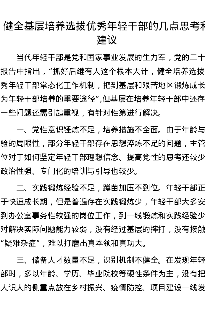 健全基层培养选拔优秀年轻干部的几点思考和建议