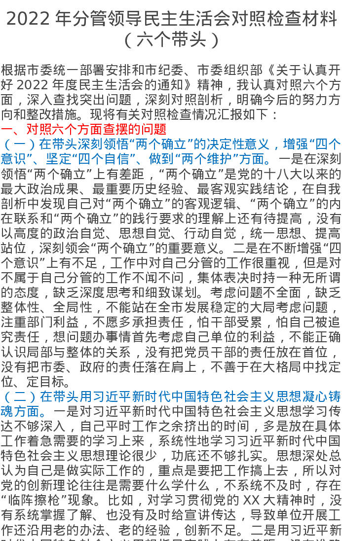 2022年分管领导民主生活会对照检查材料(六个带头)