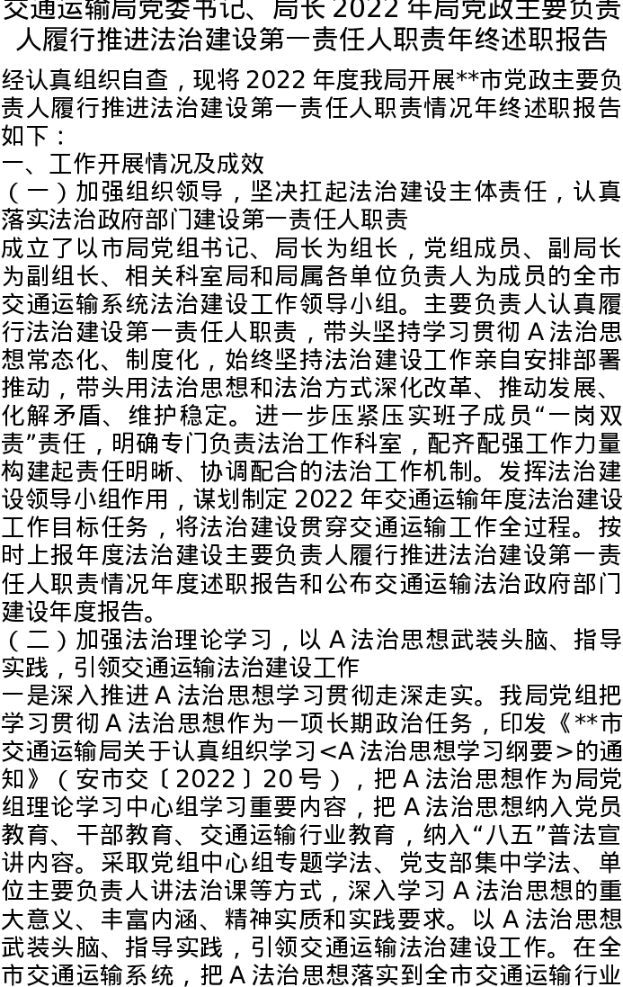 交通运输局党委书记、局长2022年局党政主要负责人履行推进法治建设第一责任人职责年终述职报告