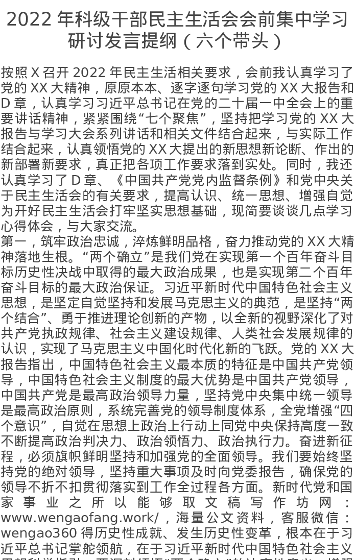 2022年科级干部民主生活会会前集中学习研讨发言提纲(六个带头)