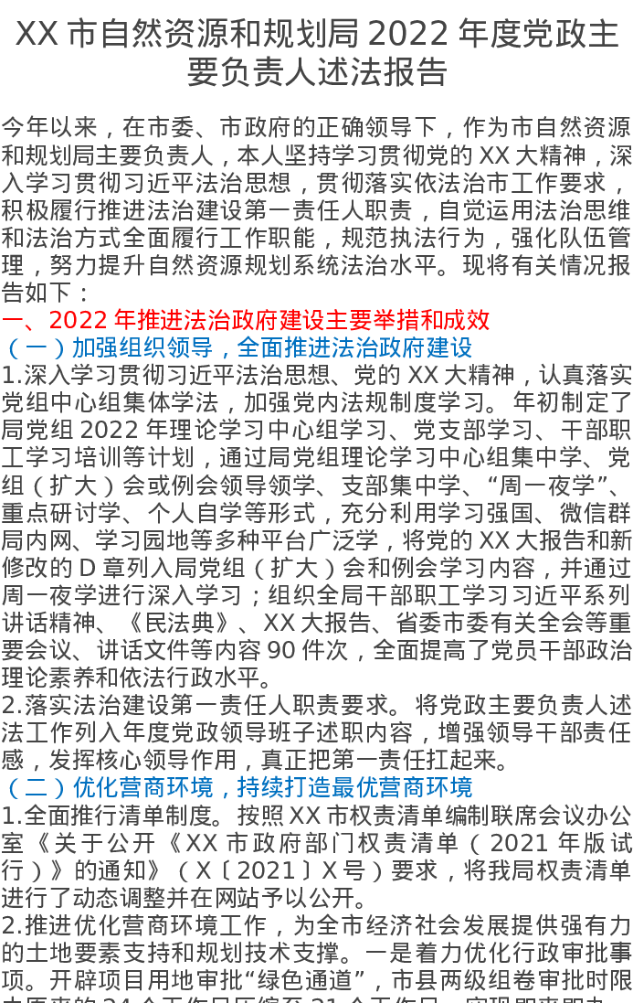 XX市自然资源和规划局2022年度党政主要负责人述法报告