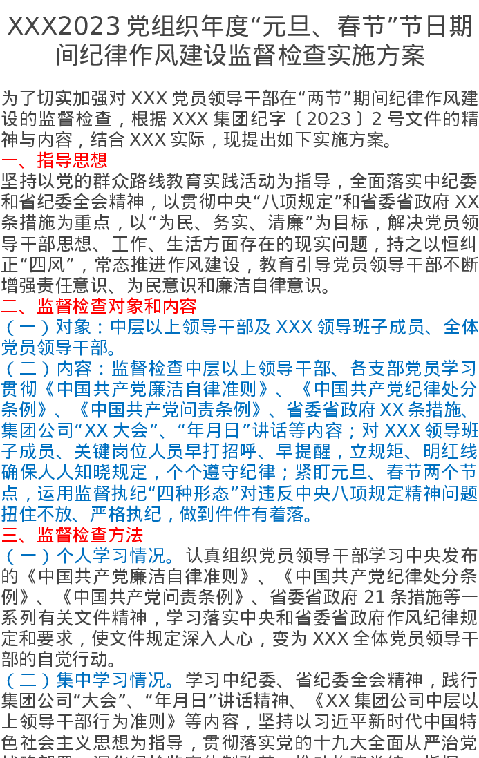 XXX2023党组织年度“元旦、春节”节日期间纪律作风建设监督检查实施方案