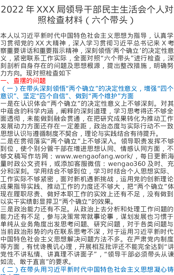 2022年XXX局领导干部民主生活会个人对照检查材料(六个带头)