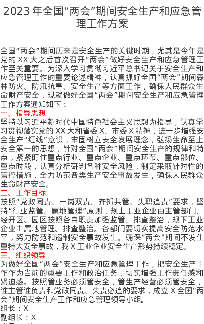 2023年全国“两会”期间安全生产和应急管理工作方案