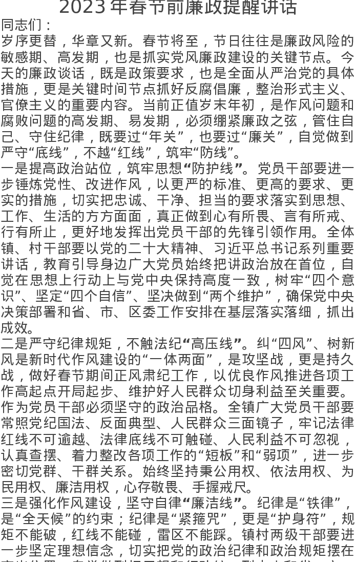 2023年春节前廉政提醒讲话