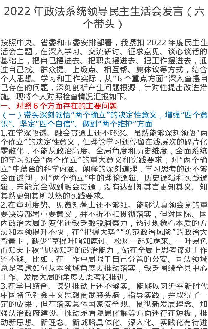 2022年政法系统领导民主生活会发言(六个带头)