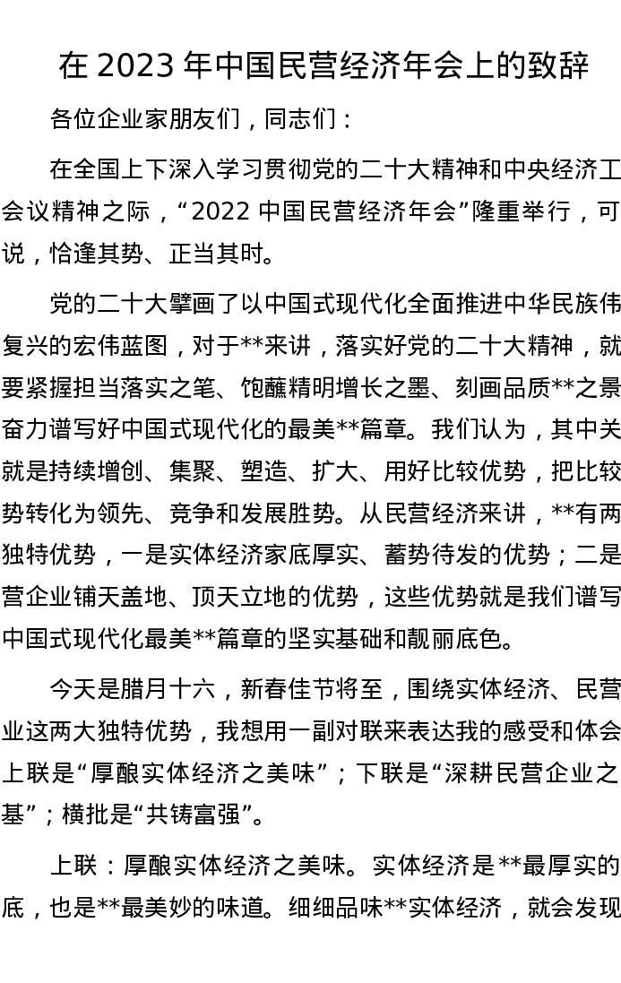 在2023年中国民营经济年会上的致辞