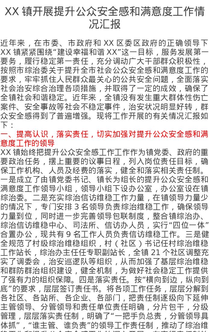 XX镇开展提升公众安全感和满意度工作情况汇报