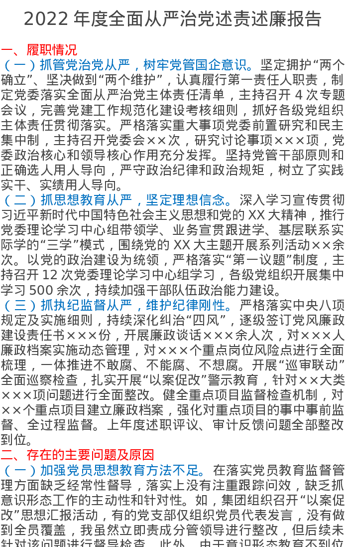 国有企业党委书记2022年度全面从严治党述责述廉报告