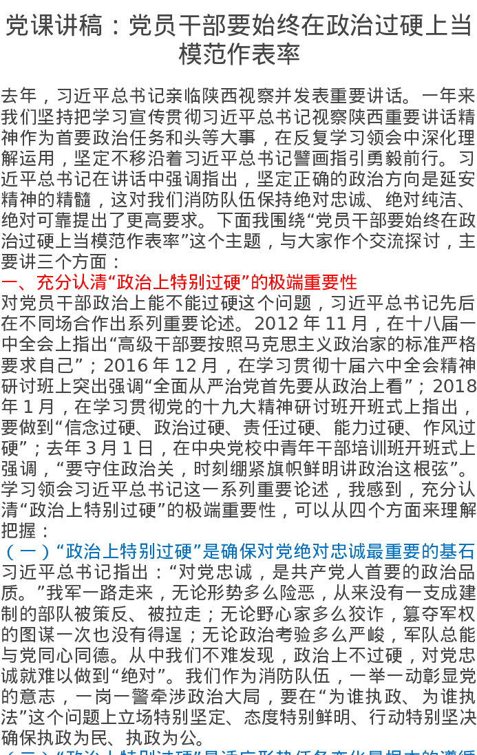 党课讲稿:党员干部要始终在政治过硬上当模范作表率