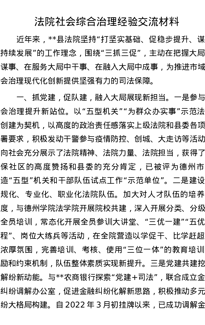 法院社会综合治理经验交流材料