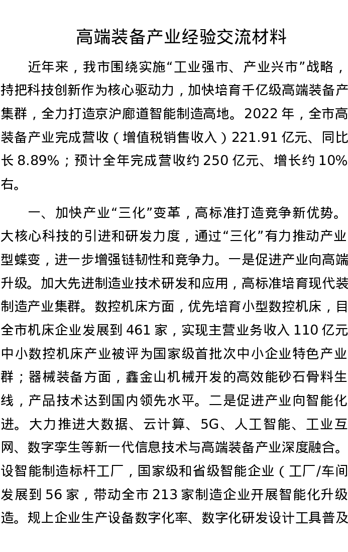 高端装备产业经验交流材料