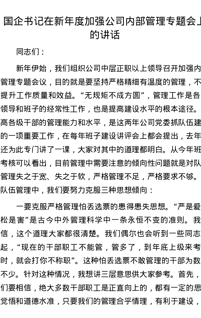 国企书记在新年度加强公司内部管理专题会上的讲话
