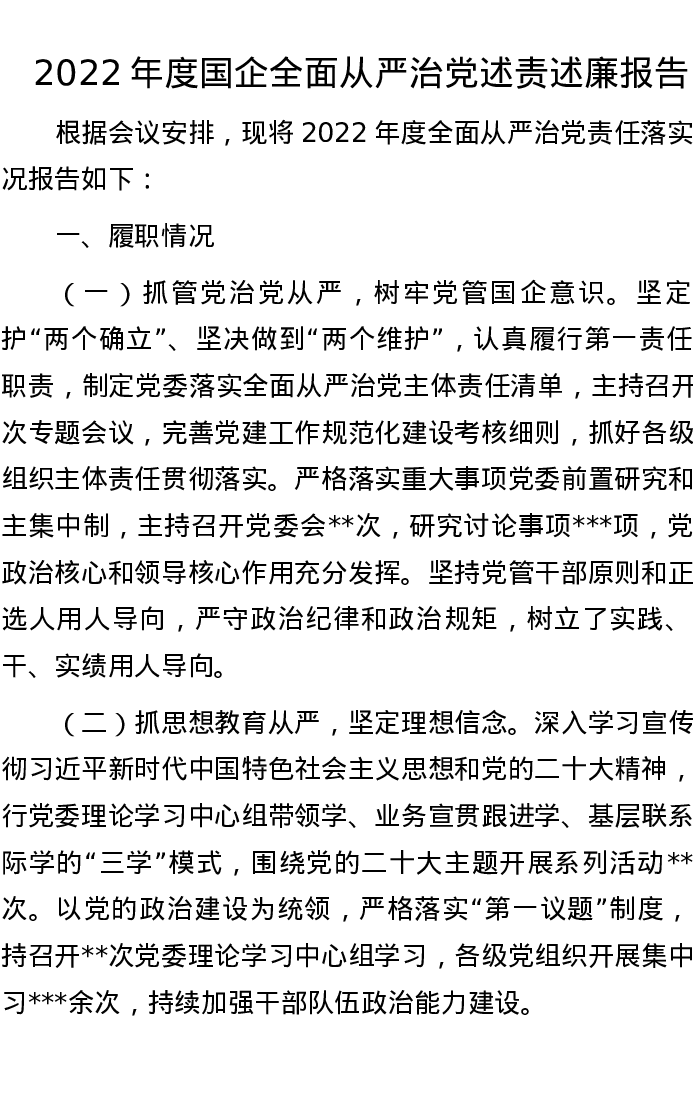 2022年度国企全面从严治党述责述廉报告