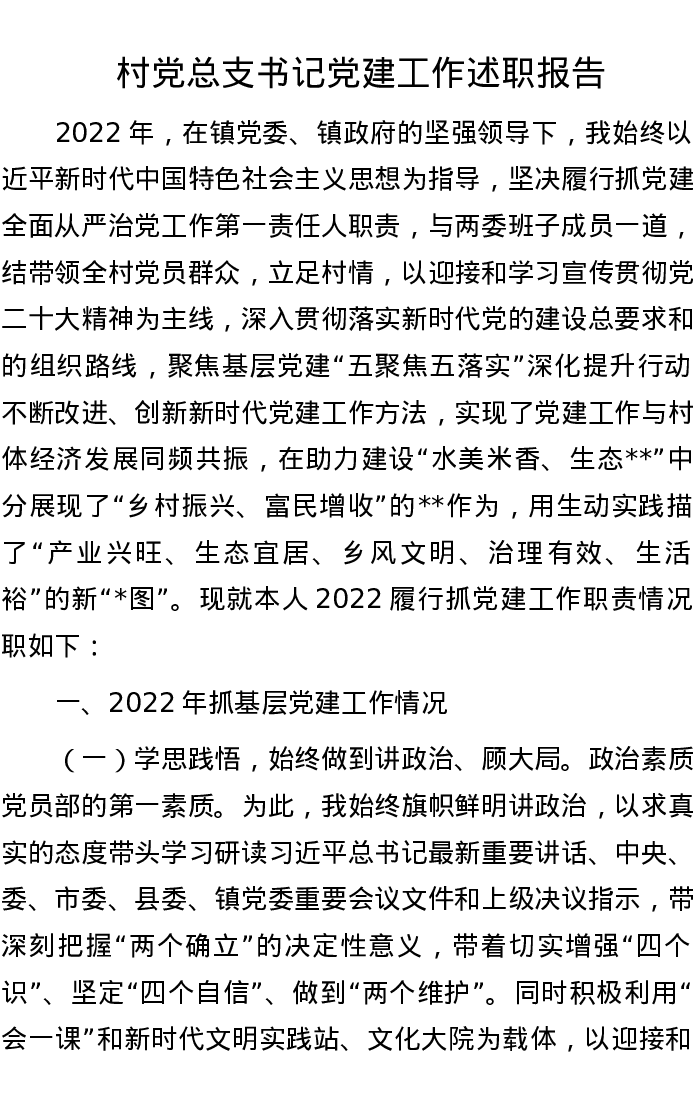 村党总支书记党建工作述职报告