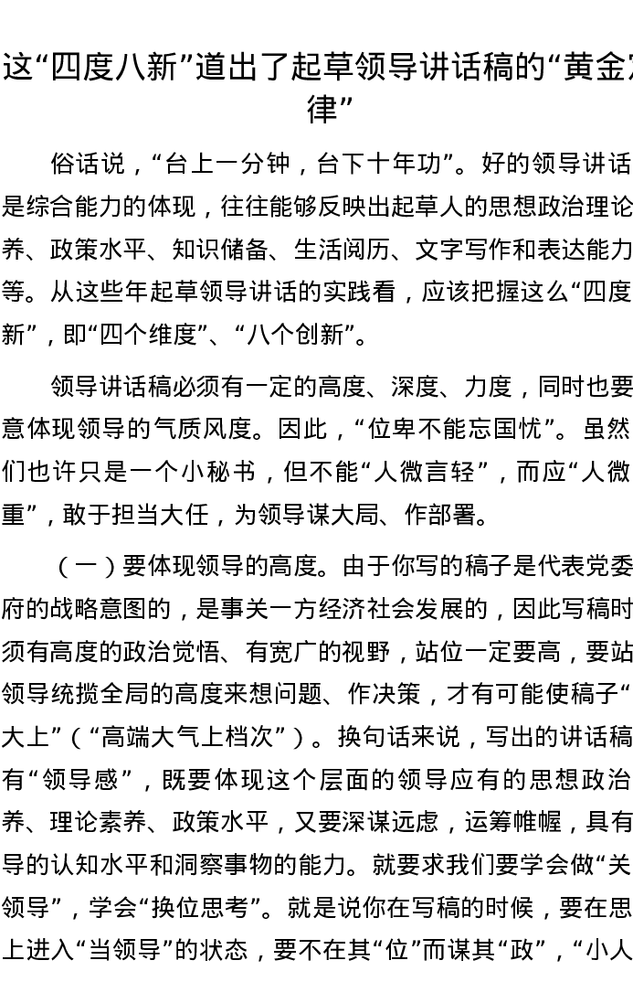 这“四度八新”道出了起草领导讲话稿的“黄金定律”