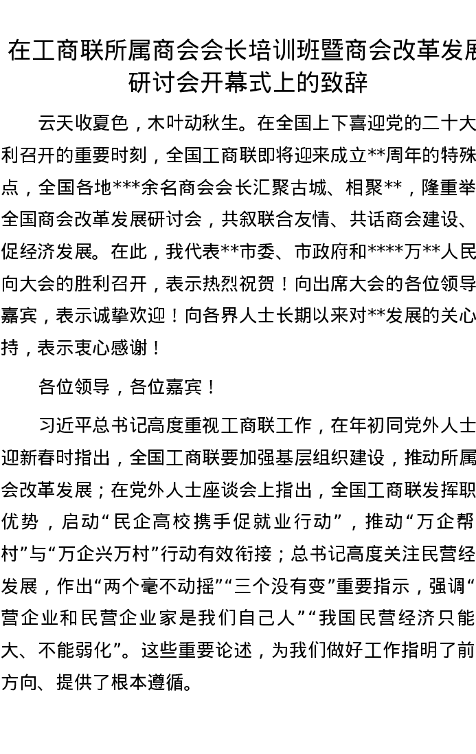 在工商联所属商会会长培训班暨商会改革发展研讨会开幕式上的致辞
