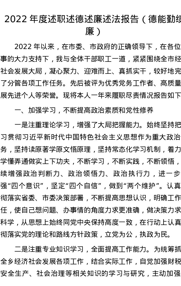 2022年度述职述德述廉述法报告(德能勤绩廉)