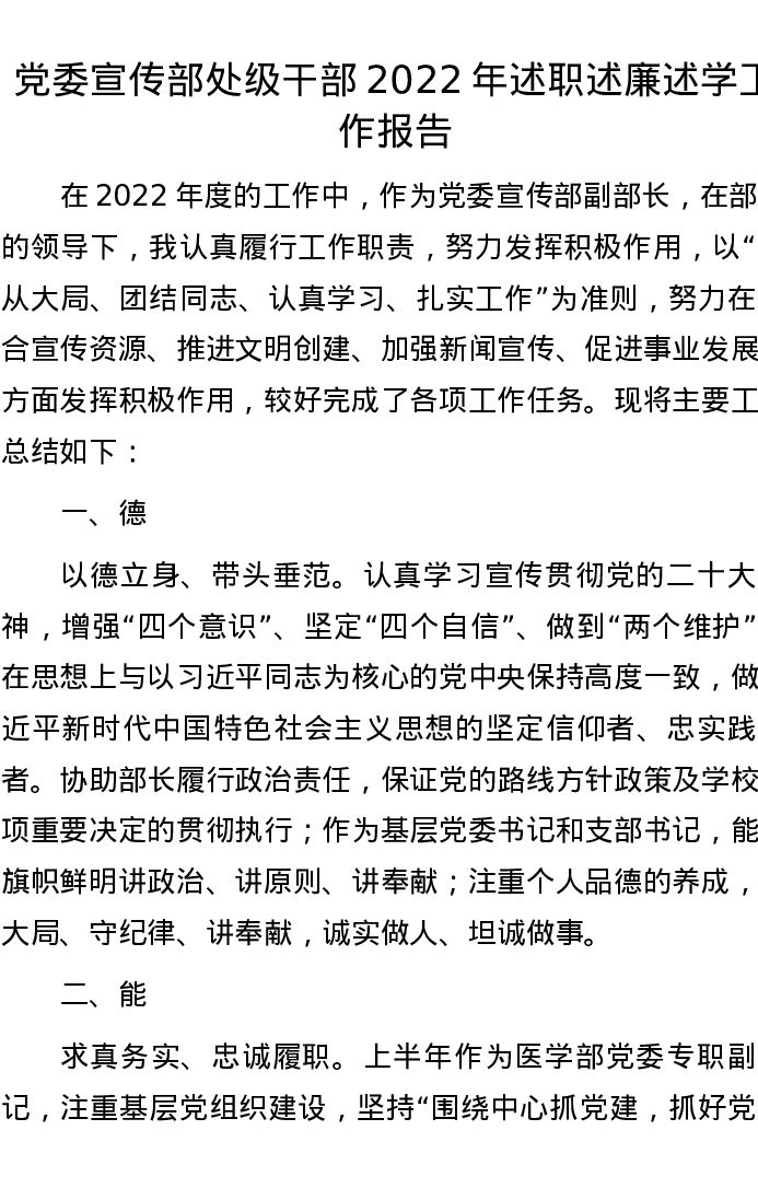 党委宣传部处级干部2022年述职述廉述学工作报告