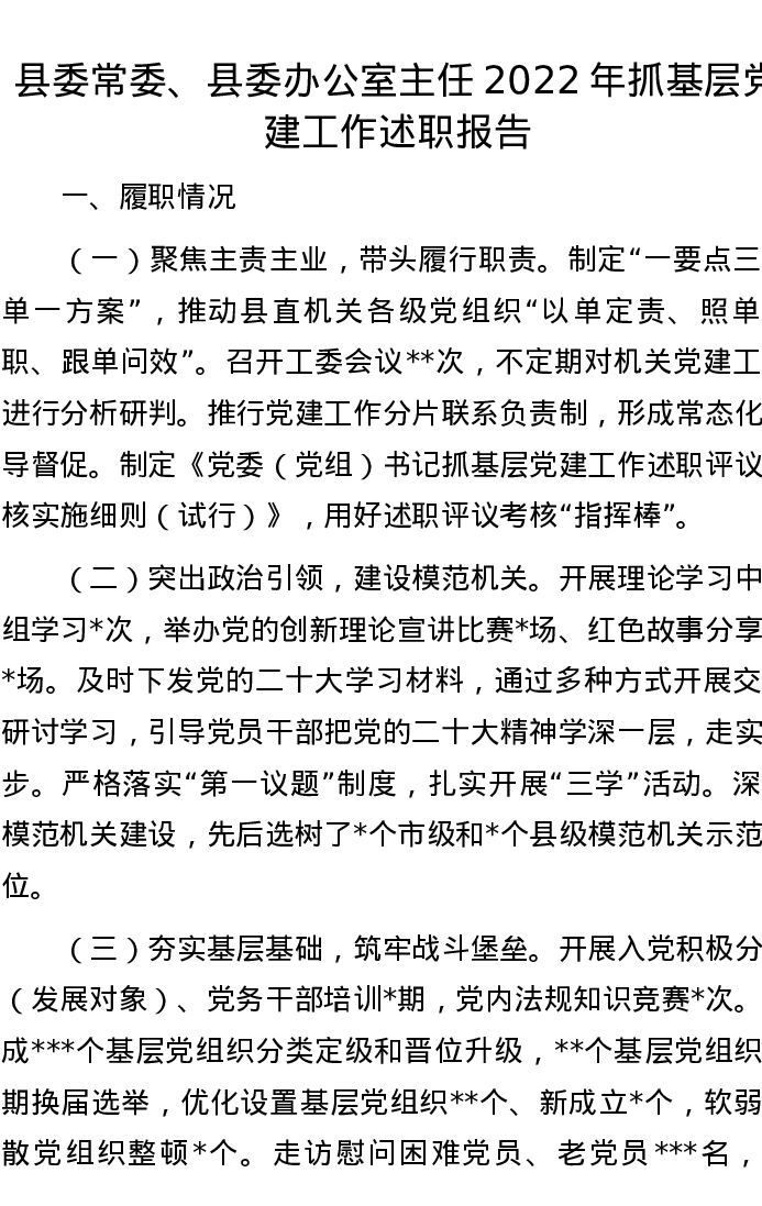 县委常委、县委办公室主任2022年抓基层党建工作述职报告