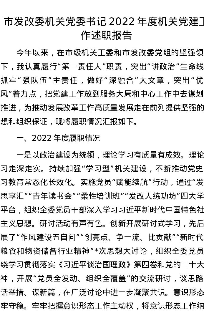 市发改委机关党委书记2022年度机关党建工作述职报告