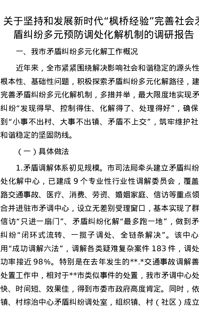 关于坚持和发展新时代“枫桥经验”完善社会矛盾纠纷多元预防调处化解机制的调研报告