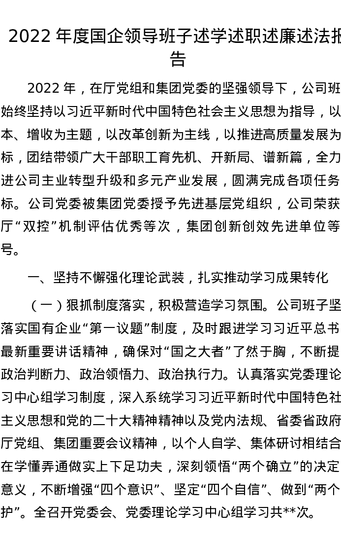 2022年度国企领导班子述学述职述廉述法报告