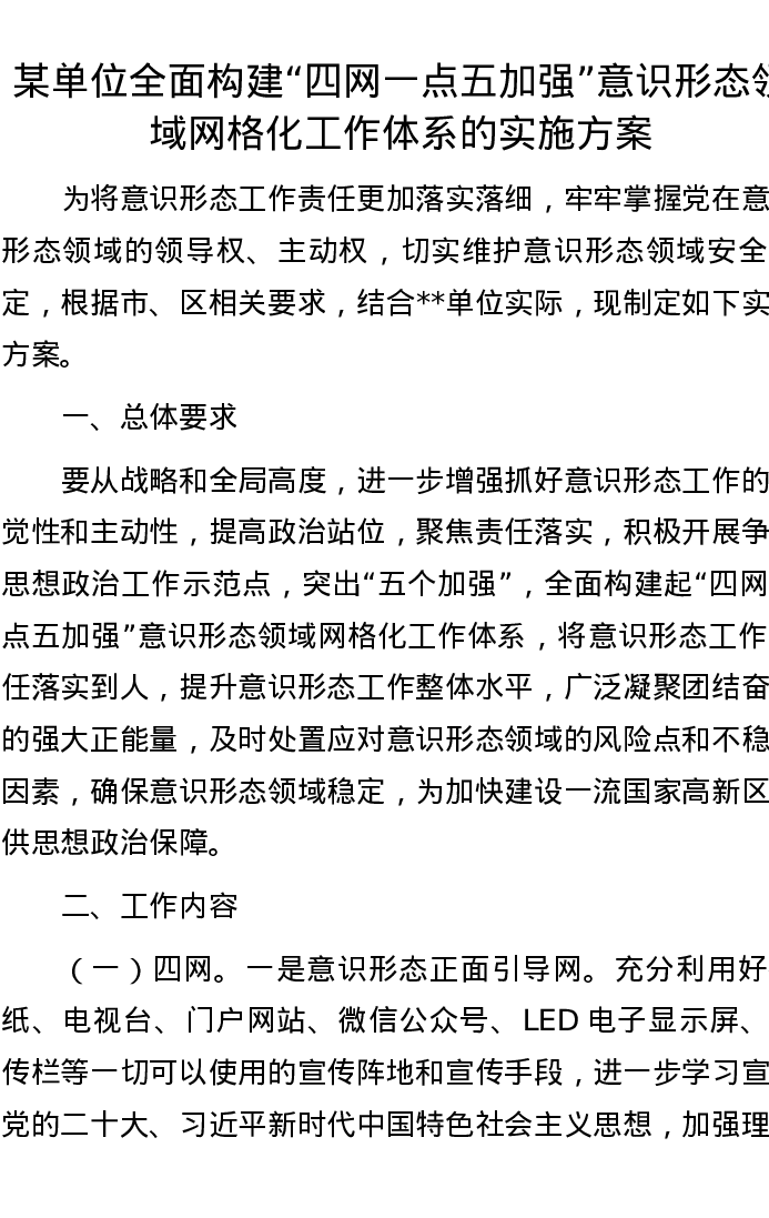 某单位全面构建“四网一点五加强”意识形态领域网格化工作体系的实施方案