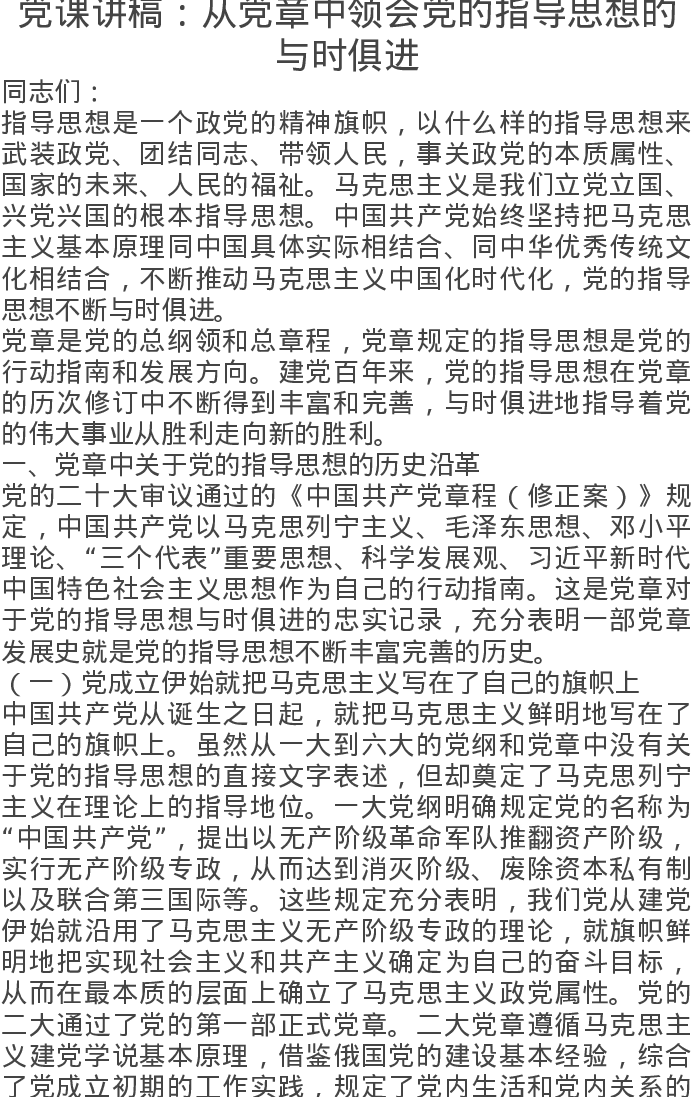 党课讲稿:从党章中领会党的指导思想的与时俱进