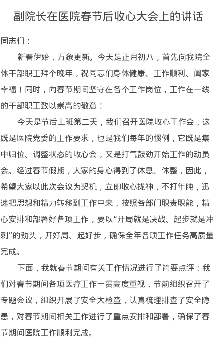 副院长在医院春节后收心大会上的讲话