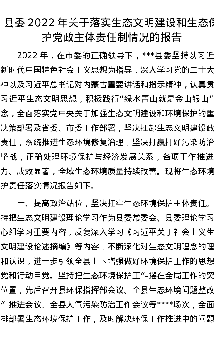 县委2022年关于落实生态文明建设和生态保护党政主体责任制情况的报告