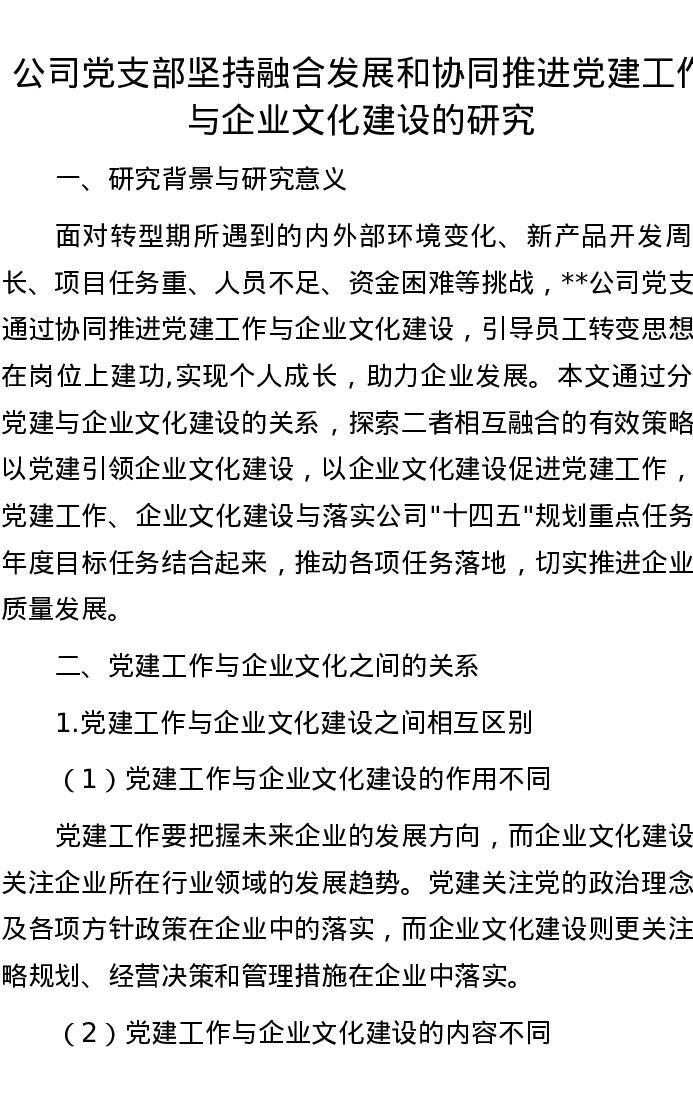 公司党支部坚持融合发展和协同推进党建工作与企业文化建设的研究