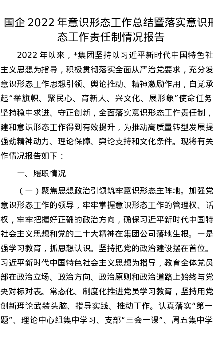 国企2022年意识形态工作总结暨落实意识形态工作责任制情况报告