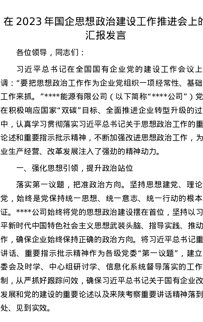 在2023年国企思想政治建设工作推进会上的汇报发言