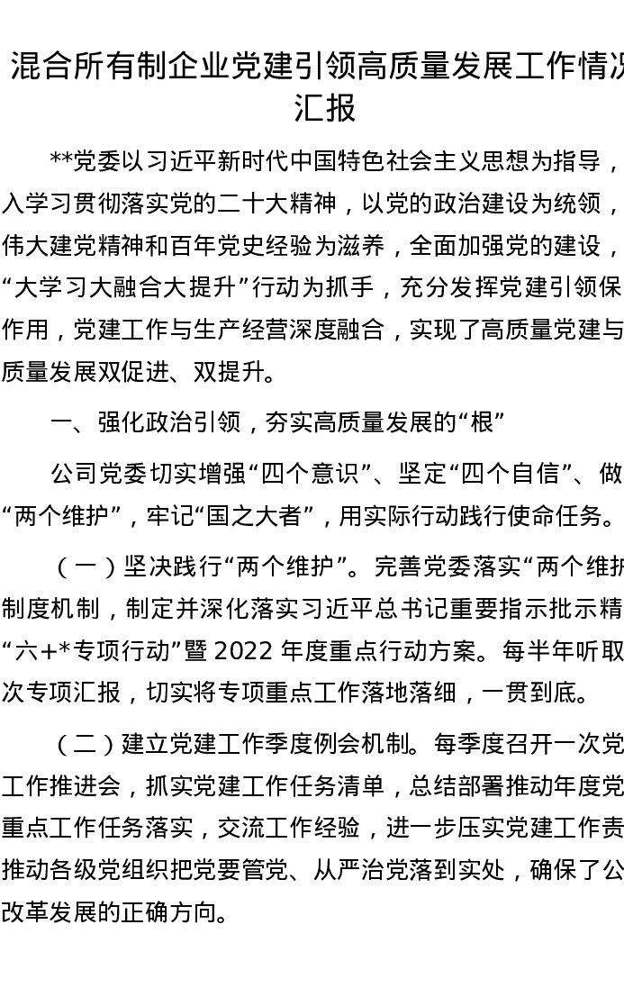 混合所有制企业党建引领高质量发展工作情况汇报