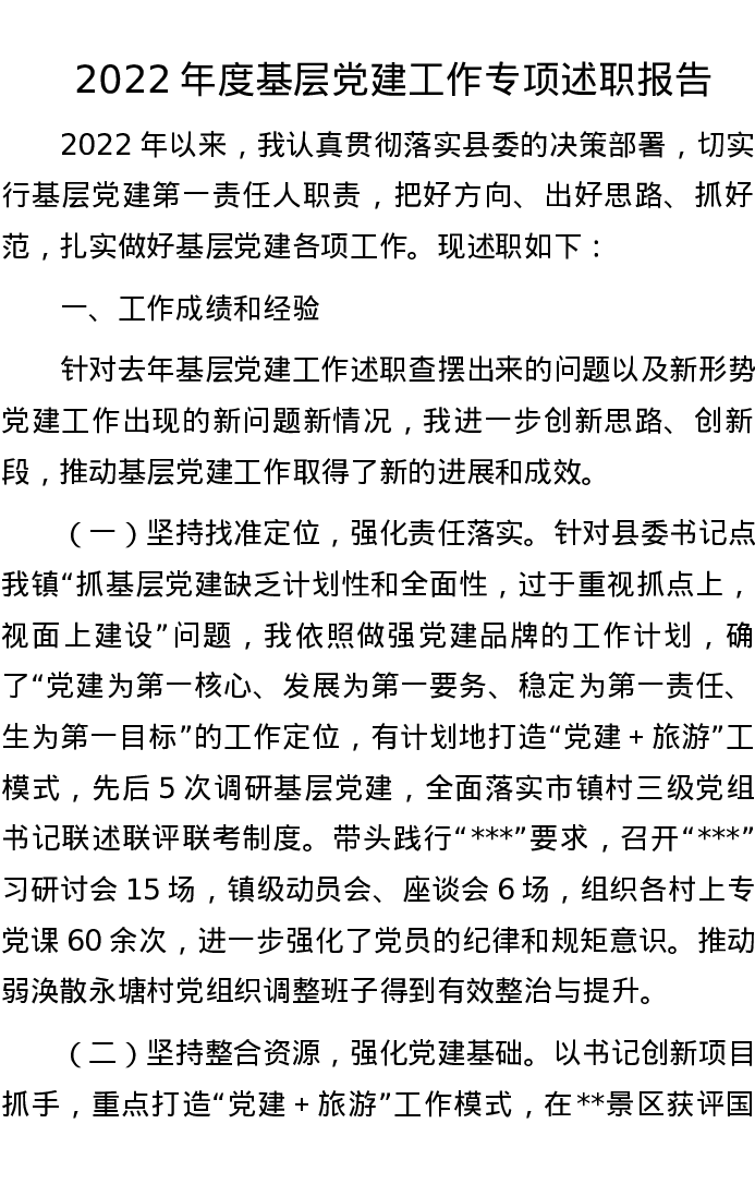 2022年度基层党建工作专项述职报告